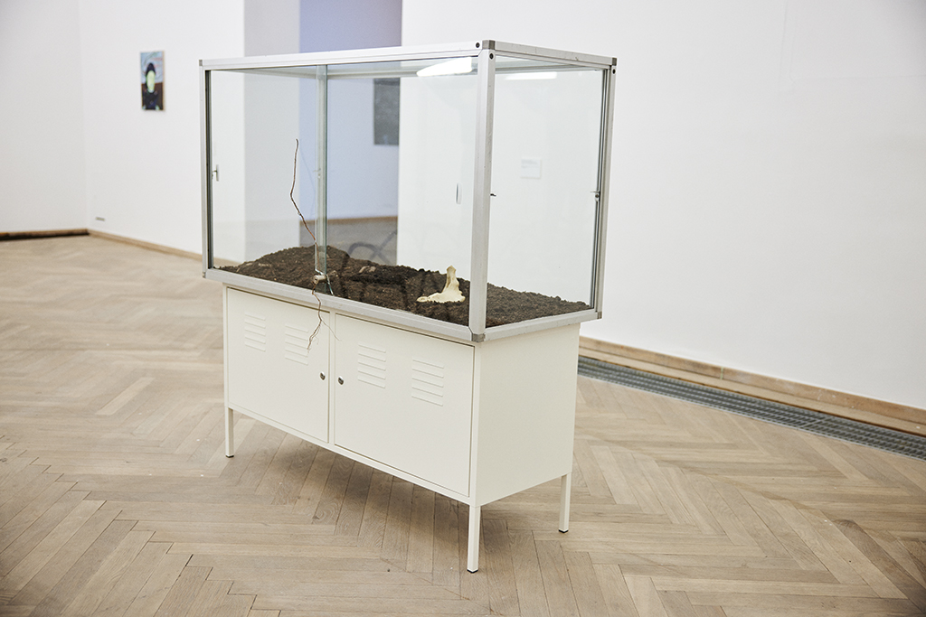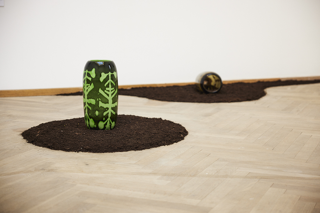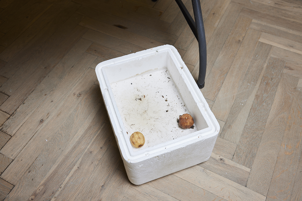 i samfundets rotation. Hvordan lever vi med disse fundamentale ændringer, katastrofer og kollaps i vores hverdag? Med forfærdelse og frygt? Med omsorg og lidenskab? Med æstetik? Årets udstilling indeholder både tydelige og subtile bud på disse kompleksiteter. Jord, utætte huse, hjemmeværns-, prepper- og campingæstetik, hengemte frugter og helligdomme derhjemme. Ikke engang i undergangen er alle lige og på udstillingen mødes dette med forskellige betingelser og udfald.