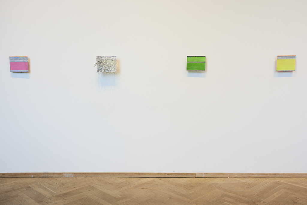 lys mangan violet x 16, lys mangan violet // neon pink x 16, dyb koboltgrøn, strålende orange. Vævet og syet. Hør, bomuld og polyester.