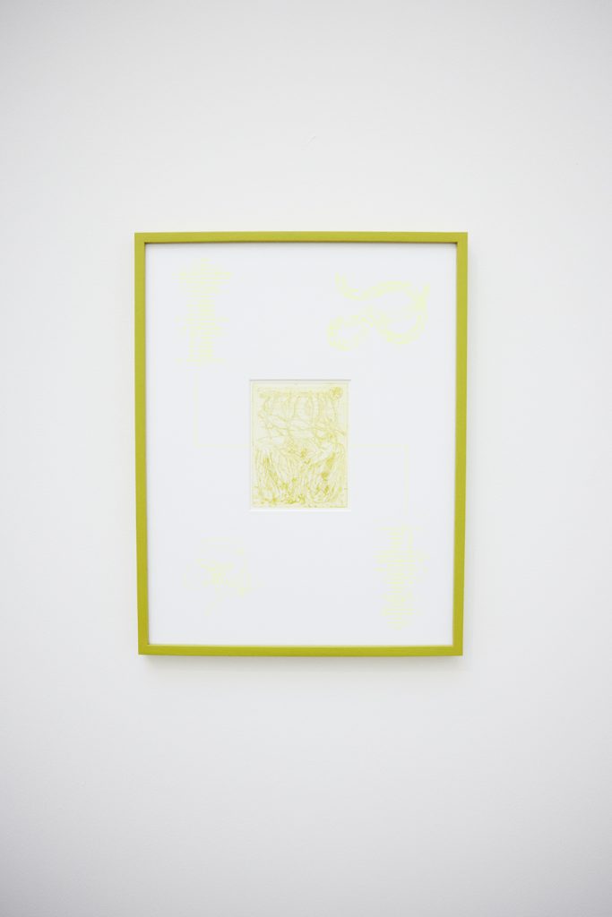 Ætsning, fluorescerende pen påført af plotter, passepartout, farvet egetræsramme